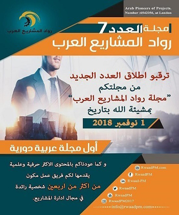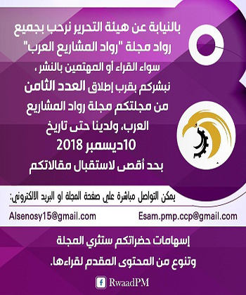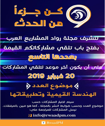 فتح باب المشاركة في العدد التاسعكن جزءاً من الحدث تتشرف مجلة رواد المشاريع العرب بفتح باب تلقي مشاركاتكم القيمة بعددها التاسع على أن يكون آخر موعد لتلقي المشاركات ٢٠ فبراير ٢٠١٩ موضوع العدد *الهندسة القيمية وتطبيقاتها* سيتم اختيار المشاركات حسب موضوع العدد وحسب ضوابط النشر بالمجلة ، كما هو مبين بالمرفقات. ترسل المشاركات للمراجعة علي: info@rwaadpm.com